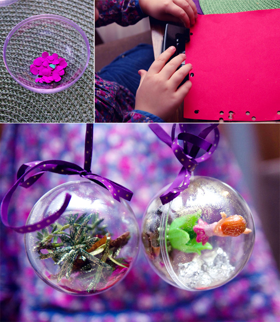Wystarczą gotowe, plastikowe, otwierane bombki, a reszta to nasz twórczość własna. My zrobiłyśmy confetti dziurkaczem. Do tego gałązki, kora oraz troszkę brokatu. I bombka gotowa!