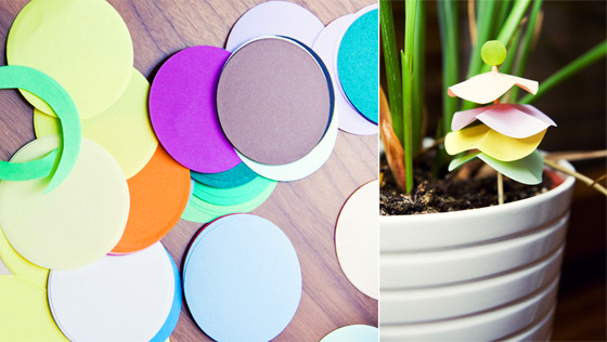 Potrzebne są nam tylko gotowe kółeczka origami w różnych kolorach, patyczki szaszłykowe, koraliki (na czubek choinki). Kółeczka składamy na pół, jeszcze raz na pół. Następnie powracamy do pierwotnego kształtu i zaginamy delikatnie wzdłuż powstałych linii. Nakładamy na patyczki i kończymy koralikiem. Takie choineczki możemy powciskać np. do doniczek.