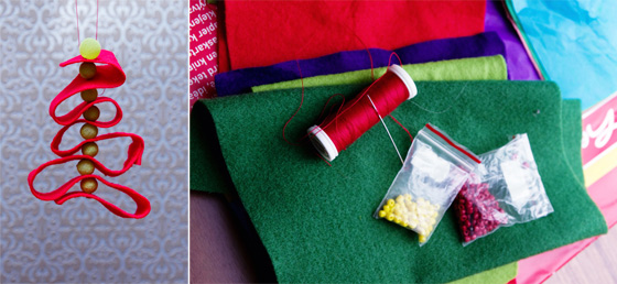 Potrzebujemy arkusze filcu w różnych kolorach, igłę i mulinę oraz koraliki. Przygotowujemy około 0,5 metrowy paseczek filcu o szerokości 1 cm. Nawlekamy na mulinę koralik i przewlekamy wstążkę, zawijając tak, aby tworzyła kształt meandru. Każdy odcinek przewleczonej wstążki oddzielamy koralikiem. Na mulinę nawlekamy coraz krótsze odcinki wstążki, tak, aby przypomniała ona kształt choinki.