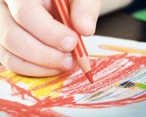 – na podłodze rozkładamy duży arkusz papieru. Dziecko kładzie się na brzuchu i ze zgiętymi łokciami maluje. Możemy przykleić kartkę do ściany, tak by dziecko malowało na niej z pozycji leżącej. W ten sposób trenuje mięśnie barków, karku, dłoni. Uczy się, w jaki sposób prawidłowo pracować nadgarstkiem. Czym malować? Kredkami, farbami plakatowymi albo przeznaczonymi do malowania palcami, kredą, z pomocą wacika, gąbki, pędzla.