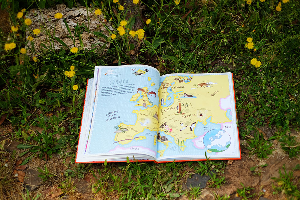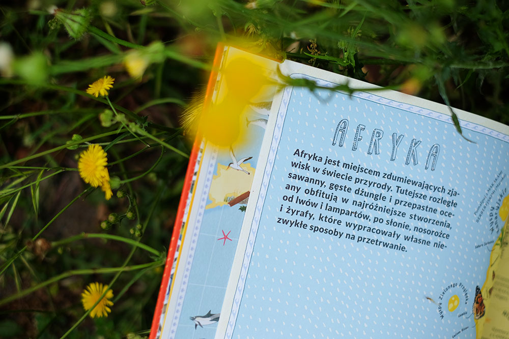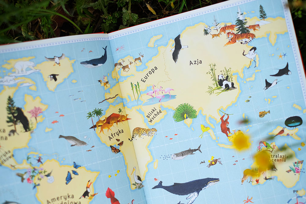 W Europie spotykamy maskonury, które latem wydrążają nory na szczycie islandzkiego klifu. Wyspy Brytyjskie zostały przedstawione jako gospodarz pszczół miodnych, a prowansalskie lawendowe łąki we Francji to ojczyzna płomykówek – gatunku sowy o giętkiej szyi, której głowa może obracać się nawet o 180 stopni! Azja i Bliski Wschód to największy kontynent na świecie. Autorki zapraszają nas tu na przykład na spotkanie z tygrysem syberyjskim oraz na spacer z pawiem indyjskim. Na Sri Lance słoniom indyjskim, mniejszym od afrykańskich kuzynów, towarzyszą wargacz leniwy i lampart lankijski. W Chinach po górach wspina się natomiast panda wielka.