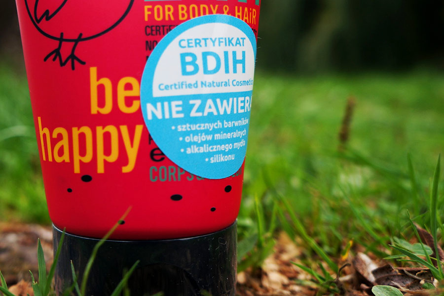 Żel do mycia ciała i włosów, opatrzony certyfikatem BDIH, który stanowi gwarancję, że dany produkt przynajmniej w większości składa się z komponentów pochodzenia ekologicznego.