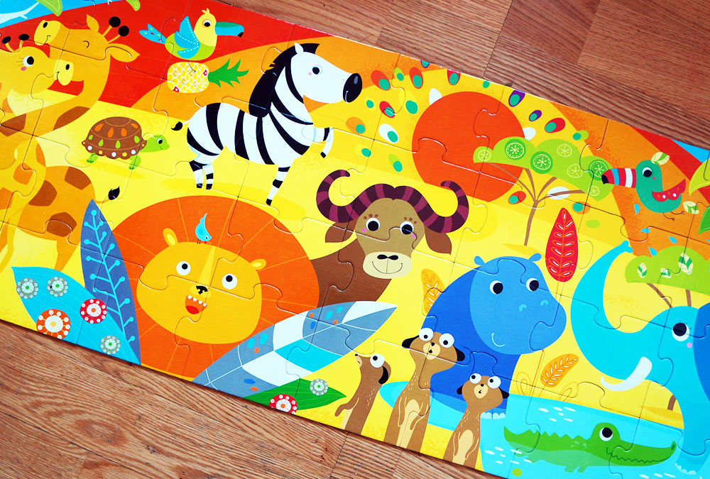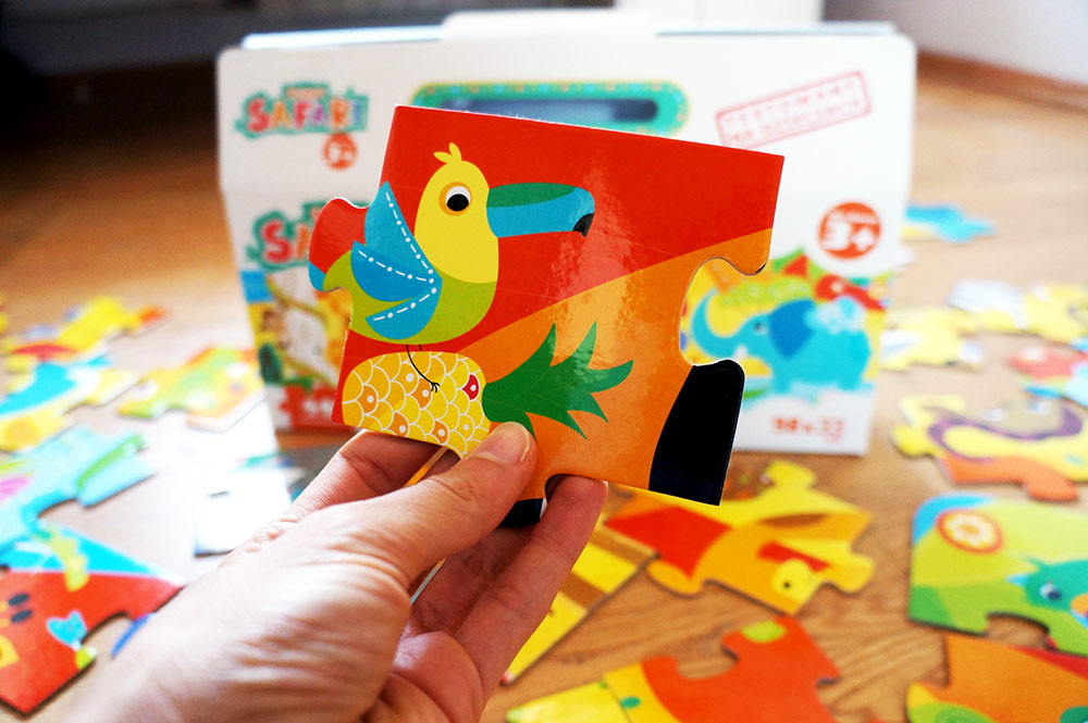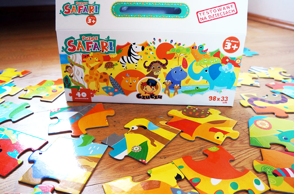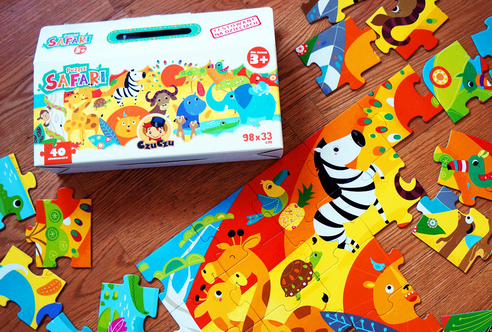 Puzzle Safari przeznaczone są dla dzieci powyżej trzeciego roku życia i składają się z 40. dużych elementów, wyciętych z naprawdę solidnej tektury, pokrytej barwnym drukiem.