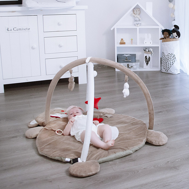 Mata edukacyjna w kształcie misia, wykonana z dzianiny o strukturze miękkiego futerka. Idealna do rozwoju umiejętności wzrokowo-ruchowych malucha. Wyposażona w kontrastowe dodatki, co dodatkowo zachęca dziecko do zabawy. Dywanik posiada dwa stabilne pałąki, na których przymocowane są cztery zabawki – dwa misie z grzechotkami, czerwona gwiazdka z grzechotką oraz piłeczka z lusterkiem.