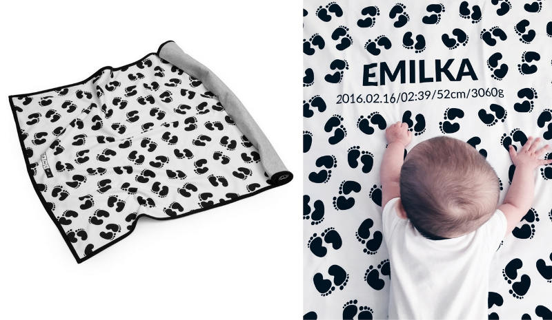 Bawełniany, czarno-biały kocyk z imieniem dziecka. Przyda się w wózku, w trakcie popołudniowej drzemki i jako mata dla najmłodszych dzieci. Niemowlęta chętnie przyglądają się kontrastowym wzorom i dzięki temu kocyk idealnie sprawdza się w okresie kiedy niemowlę ćwiczy podnoszenie główki.
