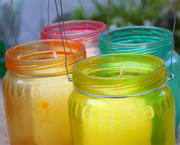 2. Mini-latarnie – słoiki można zabarwić, dzięki temu światło, które dają, stanie się magiczne. Jak barwimy? Do wieczka małego słoiczka wlewamy kilka kropli kleju białego (np. wikol), dodajemy dwie łyżki wody i trzy krople barwnika spożywczego w dowolnym kolorze. Mieszanka powinna zajmować całą powierzchnię wieczka. Zakręcamy słoiczek i potrząsamy nim aż do momentu, gdy wieczko będzie wypłukane z mieszanki. Nadmiar wylewamy ze słoiczka. Następnie wokół otworu słoiczka (obręczy) oplatamy giętki drucik i gotowe. Lampiony pięknie rozświetlają ogród czy balkon.