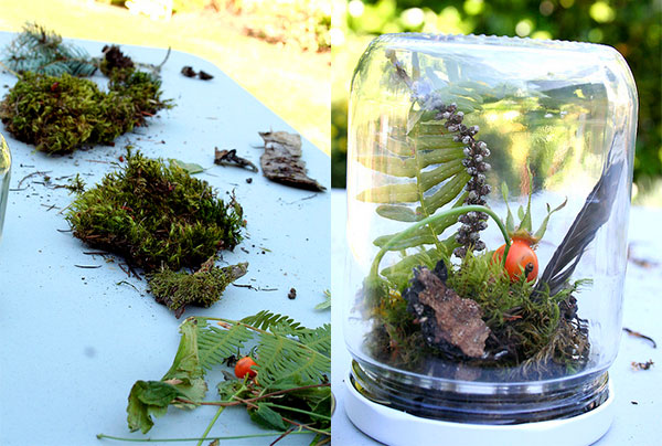 3. Miniaturowe terraria – propozycja dla młodego miłośnika natury. Potrzebujemy darów lasu, czyli np. odrobiny mchu, trawy, kwiatów, patyczków, owoców jarzębiny, szyszek czy drobnych kamyczków. Na wieku słoika tworzymy kompozycję. Pamiętajmy, by mech trochę zwilżyć.
