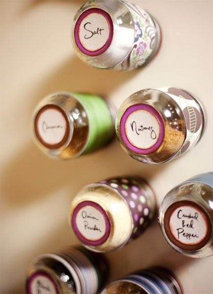 6. Pojemnik na przyprawy – pomysł ten zyskuje ostatnio na popularności. Już w kilku domach znajomych dostrzegłam takie zastosowanie pustych słoików. Słoiki pełne przypraw można przechowywać w szufladach, czemu jednak nie pokazać ich światu? Półeczka pełna aromatycznych przypraw to wspaniałe uzupełnienie każdej kuchni. Jeśli w wykonanie włożymy więcej pracy, to za pomocą magnesów można sprawić, iż słoiczki będą zajmowały minimum miejsca, ponieważ będą przylegały do ścianki lodówki.