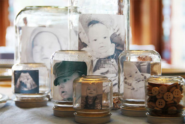 7. Słoikowe ramki na zdjęcia – zabawny gadżet do pokoju dziecka lub piękny prezent np. dla dziadków. Wykonanie banalnie proste – do słoiczka dowolnej wielkości wsuwamy zdjęcie w odpowiednim formacie. Efekt wspaniały!