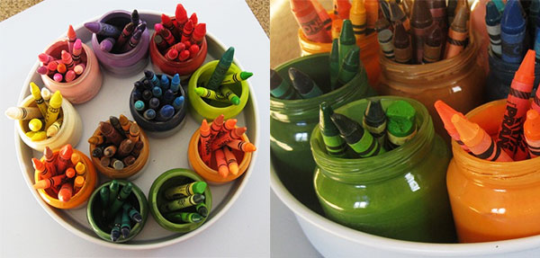 8. Pojemnik do przechowywania kredek – w moim domu kredki teoretycznie powinny się znajdować w specjalnym pudełku. W praktyce wygląda to jednak tak, że kredki są wszędzie, natrafiam na nie najczęściej podczas porządków, wtedy znajduję zaginione kolory. Słoiki można pomalować np. farbą w sprayu na kolor kredki, która będzie w nim przechowywana, np. niebieski a w nim wszystkie typy niebieskich kredek malucha. Następnie wszystkie kolorowe słoiki można przykleić do dna pudełka, tworząc w ten sposób zestaw.