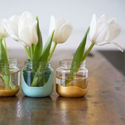 5. Wazony – wyglądają niezwykle efektownie, ozdobią każde wnętrze. Sposoby na ich zdobienie są rozmaite. Możemy okleić wazon bibułą, cekinami, obwiązać sznurkiem albo zanurzyć jakąś część denka słoika w farbie (to bardzo fajny pomysł, po zanurzeniu w farbie obracamy słoik do góry dnem, by farba mogła swobodnie spływać i tworzyć fantazyjne wzory).