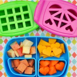 Krok 3: Do części, która cięła jedzenie, wkładamy element wypychający i energicznie go wciskamy. Małe kawałki wyskoczą z FunBites! Układamy je w dowolny sposób na talerzu, tworząc pociąg z prostokatów, rybkę z trójkatów czy kwiat z serduszek.
