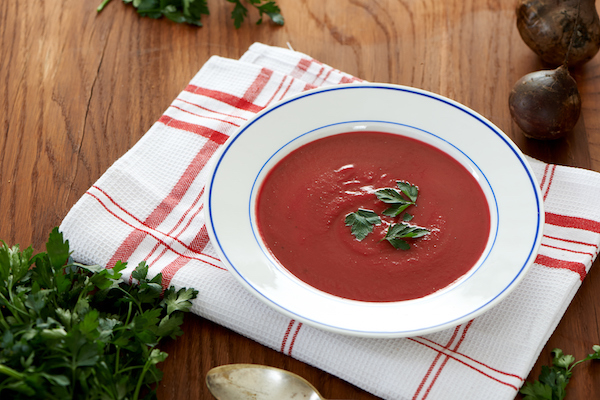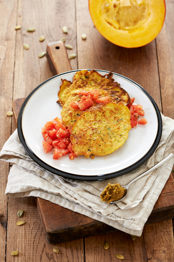Placuszki z buraka z czerwonym pesto, wytrawny mus z gruszek.