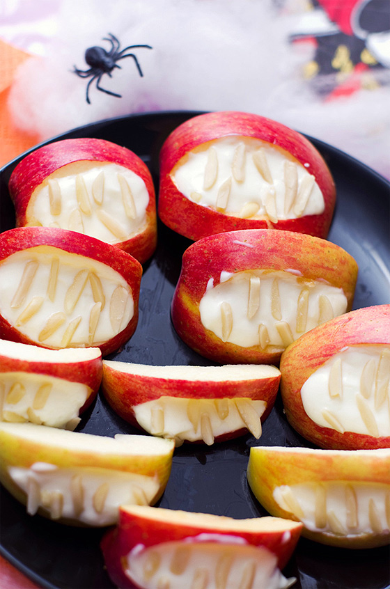 Jabłka umyć, pokroić w ćwiartki i wydrążyć gniazda nasienne. W każdej ćwiartce wykroić kliny od strony skórki tak, aby pozostała skórka na brzegach imitowała usta. Wykrojony środek wypełnić serkiem, na wierzchu serka powtykać po 5-6 migdałów z góry i z dołu imitujące wyszczerbione zęby.