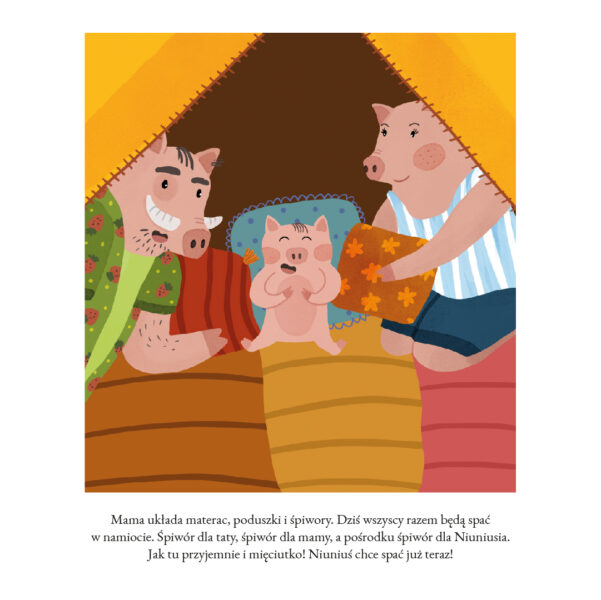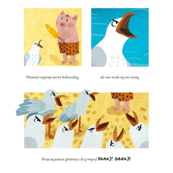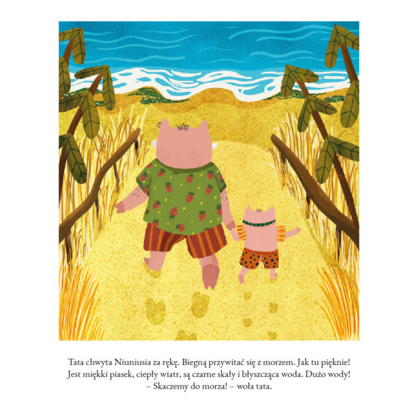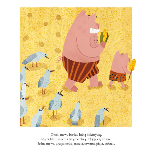 Wiosną Niuniuś bawił się w błocie i zjeżdżał z wielkiej góry ziemi – teraz z kolei próbuje łapać morskie fale, śpi w namiocie, częstuje kukurydzą mewy i ucieka przed burzą. Każdemu nowemu doświadczeniu towarzyszy mnóstwo różnych uczuć – w końcu Niuniuś nie od razu przekonuje się do piętrzących się fal (czuje się bezpieczniej na brzegu) i leżenia w namiocie (jest mu niewygodnie, a na domiar złego spokojny sen zakłóca bzyczenie komara). Niuniuś jednak się nie poddaje i stawia czoła nowym wyzwaniom. We wszystkim towarzyszą mu czujni rodzice. Zachęcają Niuniusia do różnych aktywności, pomagają mu poradzić sobie z nadciągającym smutkiem czy zdenerwowaniem, przewodzą i są blisko. Nie narzucają nic ani Niuniusiowi, ani sobie samym – zobaczcie, jak odpoczywają na plaży i siedzą przy ognisku. Zero pośpiechu! Czy to nie najlepszy sposób na spokojne wakacje?