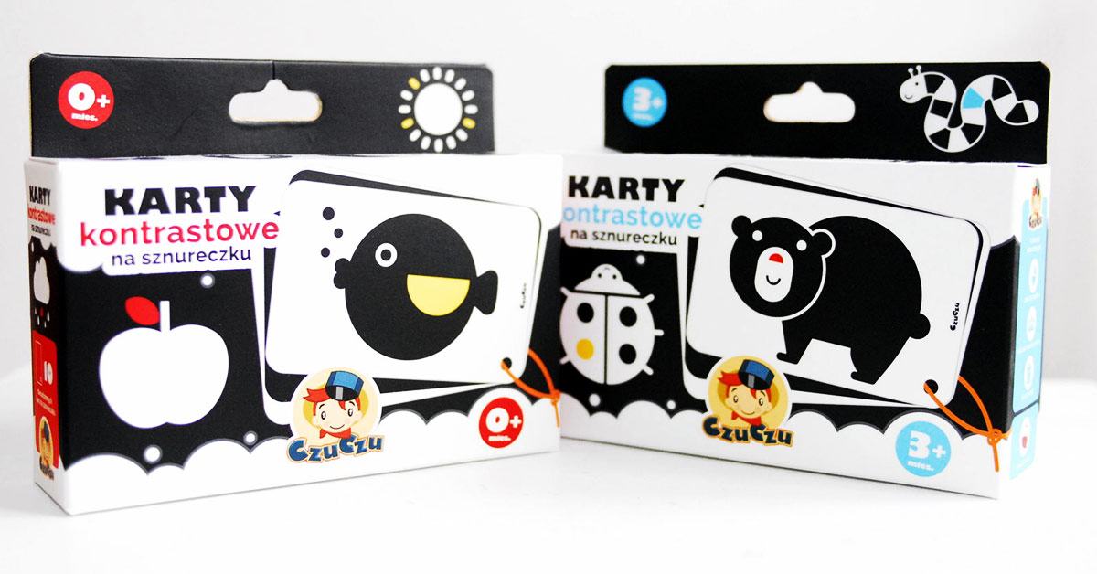 Przed paroma dniami w moje ręce trafiły Karty kontrastowe na sznureczku wydawnictwa CzuCzu. Niewiele jest w Polsce firm, które z taką pasją i konsekwencją tworzą produkty dla dzieci. Jedyna rzecz, jakiej do tej pory brakowało mi w ofercie CzuCzu, to produkty dla maluszków poniżej pierwszego roku życia. Karty kontrastowe idealnie wypełniają tę lukę. Lubię dawać CzuCzu w prezencie. Do tej pory zawsze żałowałam, że nie mogę obdarować nimi również świeżo upieczonych rodziców. Teraz jest to możliwe, a zestaw Kart kontrastowych to fajny, łatwo dostępny i niebanalny prezent dla noworodka.