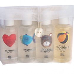 Zabawne buteleczki ekokosmetyków: mydła w płynie, żelu do kąpieli, żelu do mycia włosów i ciała oraz olejek ze słodkich migdałów, mają mały format: pojemność 100 ml. Wszystko, czego potrzebuje dziecko i mama, jest zamknięte w poręcznej kosmetyczce z materiału. Takie proste rozwiązanie, a jaki wprowadza porządek podczas rodzinnego pakowania do wyjazdu. Co zawiera kosmetyczka?