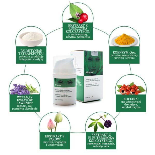Krem przeciwzmarszczkowy Richevon to siła naturalnych składników, zamknięta w wygodnym i higienicznym opakowaniu z dozownikiem. Skuteczność kosmetyku tkwi w składnikach aktywnych pochodzenia naturalnego, takich jak: