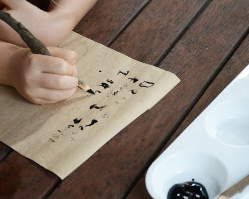 Wróżki, postaci z ulubionej bajki, sąsiada, kuzyna. Dla dzieci to nowe doświadzenie i nie lada wyzwanie, ponieważ pisanie patykową kredką po nierównej strukturze nie jest łatwe. Litery albo symbole (dzieci mogą używać tajnego kodu graficznego) mogą wyjść nieco niekształne, ale na tym właśnie polega zabawa – nie musi być idealnie!