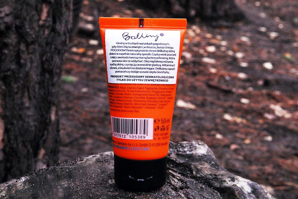 Dresdner Essenz lubię za fantazyjne opakowania i oszałamiające, naturalne zapachy, które za każdym razem, gdy decyduję się na zakup produktów tej marki, zwalają mnie z nóg. Są po prostu świetne! Krem ochronny na trudną pogodę ma finezyjny, pomarańczowy zapach przez co, nakładając go na skórę dziecka, za każdym razem czuję się, jakbym odbywała hiperszybką podróż na słoneczną Sycylię. Uwielbiam tamtejsze czerwone pomarańcze. I ten krem nie daje mi o nich zapomnieć.