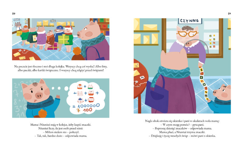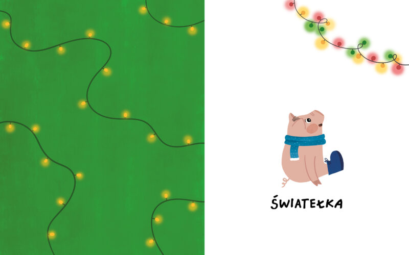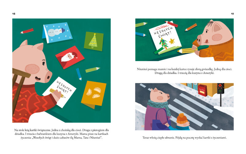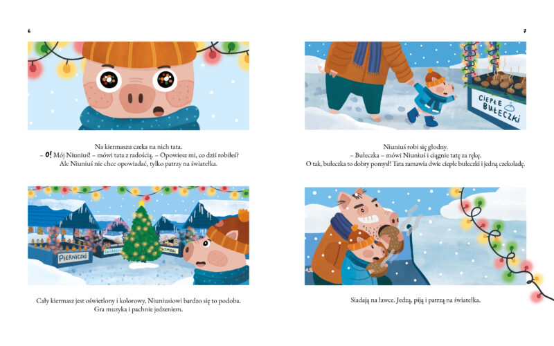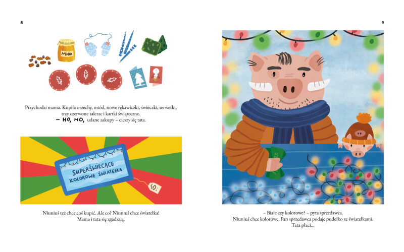 Rodzice nie stawiają samodzielnie choinki i nie kładą przed Niuniusiem pudełek z bombkami. Nasz mały bohater najpierw widzi przez okno, jak pan dostawca przywozi choinkę. Następnie tata wnosi ją do domu, a później wraz z Niuniusiem schodzi do piwnicy, by szukać ozdób choinkowych. Dopiero po przyniesieniu wszystkich kartonów przychodzi czas na zdobienie choinki (i, przy okazji, stłuczenie jednej bombki – to już taka świąteczna tradycja), zapalenie światełek, wspólne oglądanie pięknego drzewka i… sen. Niuniuś zasnął! Co dziś odczuwał? Strach, gdy nieznany pan dostawca podjechał pod ich dom. Złość, gdy zobaczył leżącą na podłodze, związaną sznurkiem choinkę – wcale mu się nie podobała! Smutek i zaskoczenie, gdy jedna z bombek nagle rozbiła się w drobny mak. I w końcu radość, gdy razem z rodzicami mógł oglądać ich wspólne, bajecznie kolorowe dzieło. Jeden dzień i tyle emocji! A jeśli zajrzycie do nowej książki o Niuniusiu z doskonałymi (jak zawsze!) ilustracjami Aleksandry Szwajdy, przekonacie się, że tych wrażeń i emocji może być jeszcze więcej. I wszystkie towarzyszą świątecznym przygotowaniom! Na końcu przychodzą święta. Jak ten grudniowy czas szybko płynie…