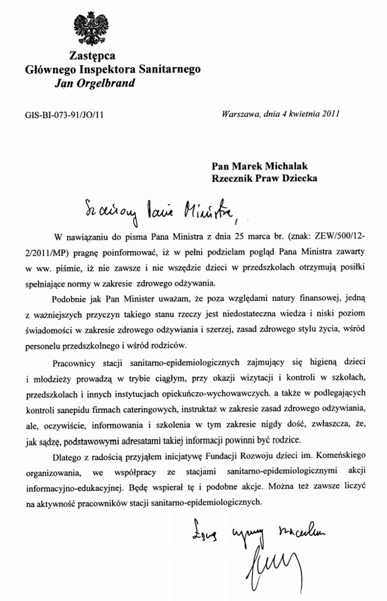 List Rzecznika Praw Dziecka w sprawie zmiany diety przedszkolnej