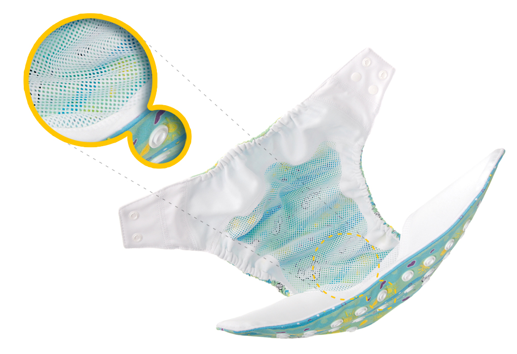 Otulacz zawiera wewnątrz siateczkę, która izoluje skórę dziecka przed bezpośrednim kontaktem z laminatem PUL. Chroni też warstwę wodoodporną pieluszki przed zadrapaniem paznokciami rodziców.