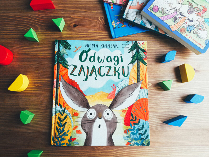 Zaczęłam od kontynuacji książki polskiego autora, teraz czas na debiut angielskiej ilustratorki. I to debiut nie byle jaki, bo taki, który niedługo po premierze został okrzyknięty bestsellerem w trzydziestu krajach! Książka „Odwagi, zajączku” Nicoli Kinnear nie jest więc nowością na rynku wydawniczym, jednak czuję, że powinna się tu znaleźć – sukces debiutanckiego tytułu sprawił, że w niedługim czasie spod pędzli autorki wyszła cała seria książek. Opowieści, które doczekały się już polskiego wydania, znajdziecie w naszej księgarni. Wszystkie są mądre, piękne i wartościowe zarówno dla najmłodszych dzieci, jak i trochę starszych czytelników. Nie będę dziś przedstawiać wam wszystkich, bo fenomen tej serii polega na tym, że gdy już przeczytacie pierwszą część, to z automatu chcecie sięgnąć po kolejne. Tylko dlaczego?