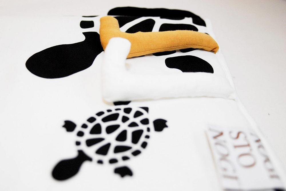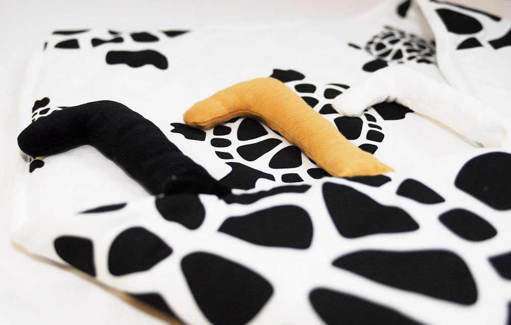 Bo to nie tylko ciepły i pięknie zaprojektowany kocyk dla malucha, ale też narzędzie stymulujące jego zmysły. Utrzymany w czarno-białej, mocno kontrastowej tonacji, pozwala dziecku wodzić wzrokiem po konturach fantazyjnych wzorów. Warto pamiętać, że w pierwszych tygodniach życia malucha to właśnie wzrok jest najsłabiej rozwiniętym zmysłem, do tego noworodek nie rozróżnia jeszcze kolorów – widzi jedynie kontrastowe zestawienia czerni i bieli, pod warunkiem jednak, że są one duże i wyraźne. To dlatego Maria Montessori zalecała tym najmniejszym dzieciom zawieszać nad łóżeczkami czarno-białe mobile. Kołderka NOGISTONOGI pełni podobną funkcję, pobudzając wzrok i odpowiadając na realną potrzebę przyglądania się światu. To oczywiście nie przypadek, że NOGISTONOGI poszły właśnie w tę stronę. Autorzy tych fantazyjnych rożków i pościeli ściśle współpracują przy swoich projektach z psychologami rozwojowymi i neonatologami. To dzięki temu okrycia te wyposażone zostały w końcówki sensoryczne, o różnej fakturze i wypełnieniu.
