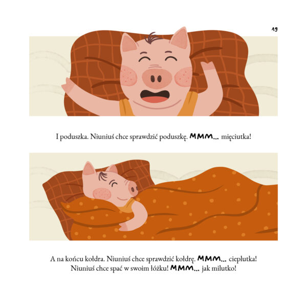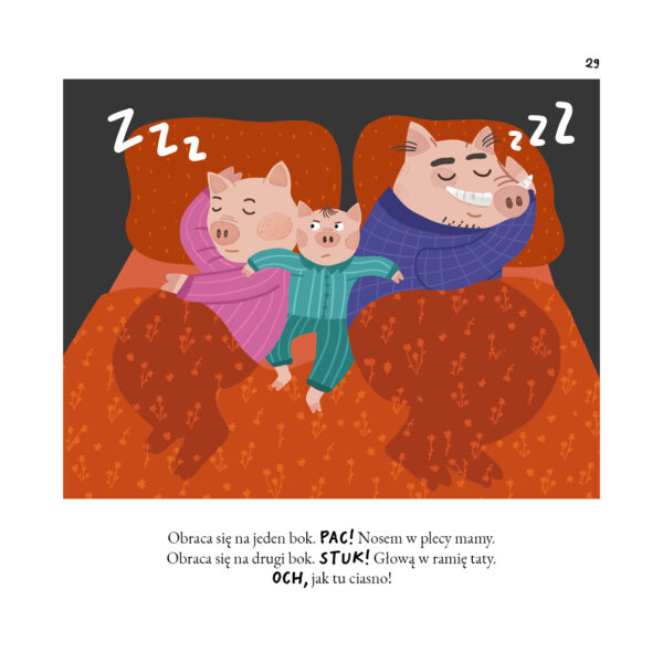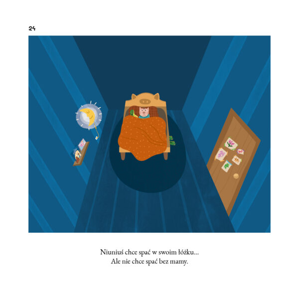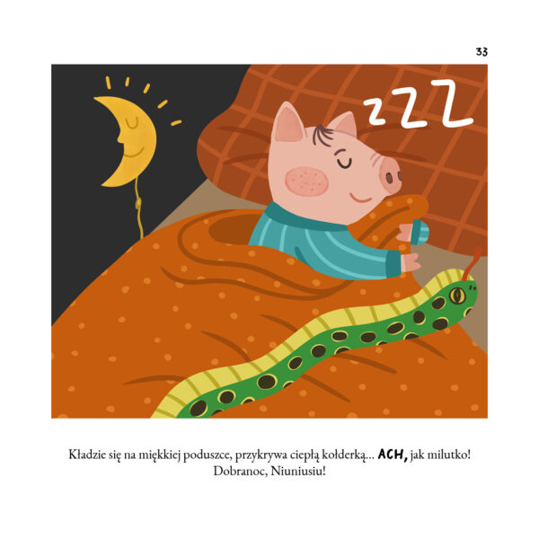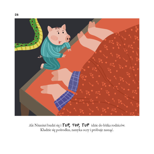 Spójrzcie, że zrozumienie emocji i potrzeb, zapewnienie poczucia bezpieczeństwa i dbanie o wieczorne rytuały (w tym przede wszystkim o noski, noski dla taty i buziak dla mamy) skutecznie zastępuje tu samotne wypłakiwanie. Tutaj nikt nie płacze, nie spada ani jedna łza! Nie ma żadnych treningów, a mimo to Niuniuś z przyjemnością wskakuje pod swoją kołderkę i idzie spać. To nie dzieje się od razu – w rozwoju dziecka nic nie dzieje się od razu. Ale gdy przychodzi odpowiedni (dla dziecka!) czas, w końcu coś się zmienia i tak już zostaje. Czasami trzeba wielu dni czy tygodni spokojnych rozmów, a czasami za ważną decyzją stoi… przypadek. A jak było u Niuniusia? Cóż, być może nadal spałby z rodzicami, ale któż by wytrzymał w ich łóżku, kiedy oni tak… chrapią?! „Niuniuś śpi bez mamy” nie jest jednak zarezerwowany tylko dla chrapiących czytelników – on jest dla wszystkich. Możecie spać spokojnie.