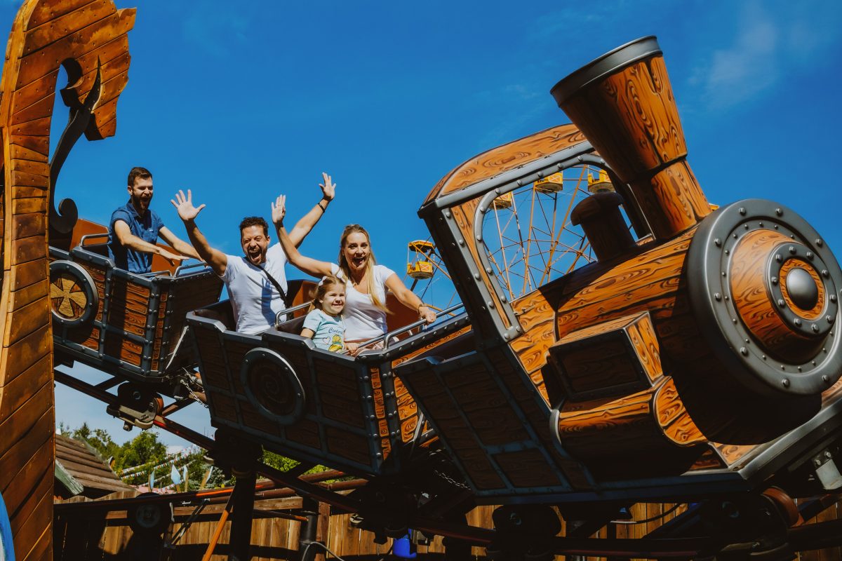 • Wioskę Wikingów z karuzelą typu „młot”, rollercoasterami w skandynawskim stylu oraz wodnym placem zabaw dla dzieci;