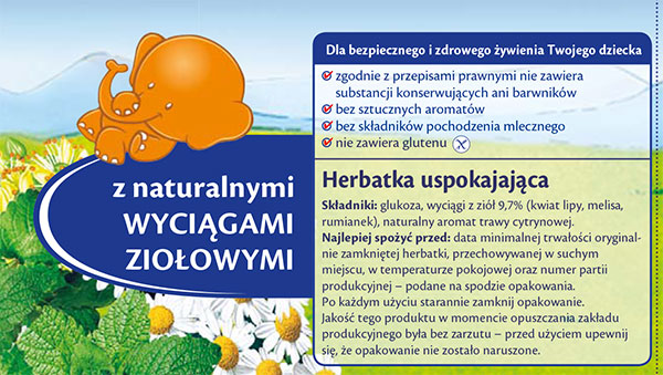 Zobaczmy teraz napoje przeznaczone dla dzieci. Jedna z firm oferuje dla swoich najmłodszych konsumentów herbatkę uspokajającą. Już na pierwszym miejscu w składzie wymieniono glukozę, a oznacza to, że jest to składnik, który został wykorzystany do produkcji tego napoju w największej ilości.