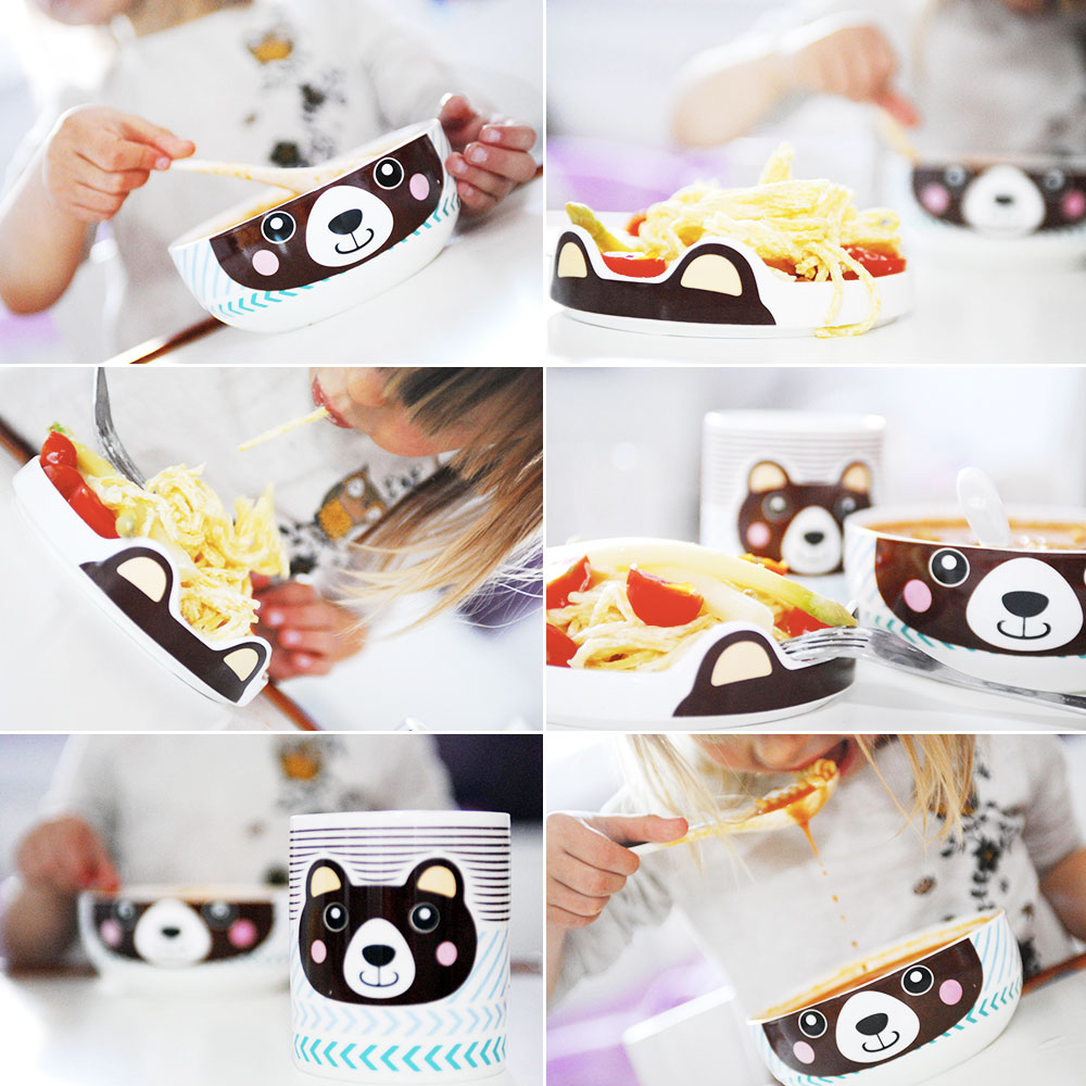W komplecie znajdziemy miseczkę, talerzyk, łyżeczkę i kubek z motywem misia, co powoduje, że to idealny komplet na niemal każdy posiłek. Rano można w nim zaserwować płatki z mlekiem bądź kaszkę z jabłkiem, w ramach obiadu – pierwsze i drugie danie, a na kolację przygotować choćby placuszki polane syropem klonowym. Naczynia są idealne na małe, dziecięce porcje, świetnie mieszczą się w rączkach i są znacznie przyjemniejsze od powszechnego plastiku. Odkąd w domu mieszka z nami misiowa zastawa, obiady, śniadania, a nawet poranne kakao smakują zupełnie inaczej. Estetyka podania posiłku też ma znaczenie!