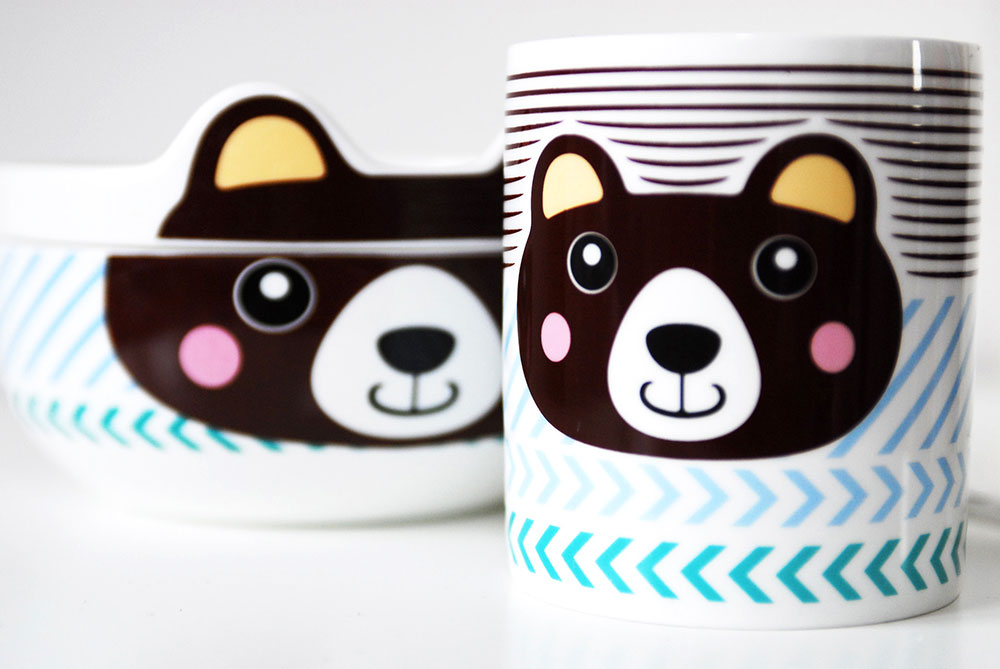 • świetny design, który idzie w parze z praktycznością; oryginalnym rozwiązaniem jest talerzyk tworzący komplet z miseczką – gdy nałożymy talerz na miskę, miś będzie miał „talerzykowe uszka”,