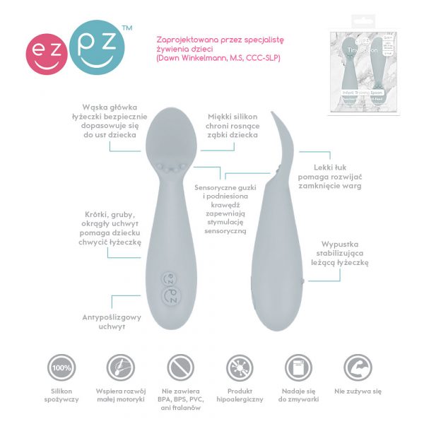 Łyżeczka dla malucha powinna być przede wszystkim mała i miękka, żeby łatwo można było nią manipulować bez zagrożenia uszkodzenia delikatnych dziąsełek i małych ząbków. Materiałem, który spełnia te warunki, a dodatkowo nie absorbuje bakterii, grzybów czy pleśni jest silikon spożywczy (hipoalergiczny, wolny od BPA, PVC, ołowiu czy ftalanów). I to właśnie z niego wykonane są innowacyjne Tiny Spoon amerykańskiej marki EZPZ. Tiny Spoon posiadają również delikatne wygięcie, które pomaga w nauce domykania ust oraz cztery wypustki na krawędzi wewnętrznej, by stymulować sensorycznie usta, dziąsła/ząbki dziecka i w ten sposób zapobiegać zadławieniu się. Taka łyżeczka sprawdzi się zarówno podczas karmienia dziecka przez rodzica, jaki w trakcie samodzielnych prób jedzenia. Jeśli chcemy podawać dziecku pokarm łyżeczką, należy pamiętać, że powinniśmy siedzieć naprzeciwko niego i kierować łyżeczkę poziomo do ust, lekko dociskając nią środek języka. To ostatnie działa aktywizująco na język i wargi i ułatwia zgarnięcie pokarmu z łyżeczki. Jednocześnie, przez cały okres rozszerzania diety warto umożliwić dziecku samodzielną manipulację łyżeczką, zabawę nią, aby ostatecznie około 12-14 m.ż. zaobserwować pierwsze udane próby jedzenia łyżką.