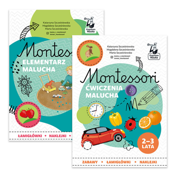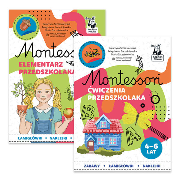 Dziś nazwisko jednej z pierwszych włoskich lekarek pojawia się na wielu różnych zabawkach i książkach, mimo że nie zawsze spełniają one wszystkie założenia stworzonego przez Marię Montessori systemu edukacji. Zupełnie inaczej jest w przypadku montessoriańskiej serii od Kapitana Nauki. Już we wstępach do obu elementarzy autorki zwracają się do rodziców, wyjaśniając, jakie są najważniejsze założenia metody Montessori i wskazując, w jaki sposób ich książki te punkty realizują. Duży nacisk kładą również na wsparcie, które rodzice na różnych etapach rozwoju dziecka mogą mu dać, by umożliwiać mu bezpieczne doświadczanie świata wszystkimi zmysłami. Razem z wszystkimi wymienionymi pozycjami dzieci mogą doskonalić koncentrację, koordynację i precyzję ruchów, a w kolejnych krokach pisanie, czytanie, a nawet wspólne tworzenie opowieści. A wiecie, dlaczego te książki stanowią naprawdę wyjątkowy prezent? Bo, oprócz ciekawych łamigłówek, na dzieci czekają tu także zabawy, wycinanki i naklejki! Nuda wam nie grozi!