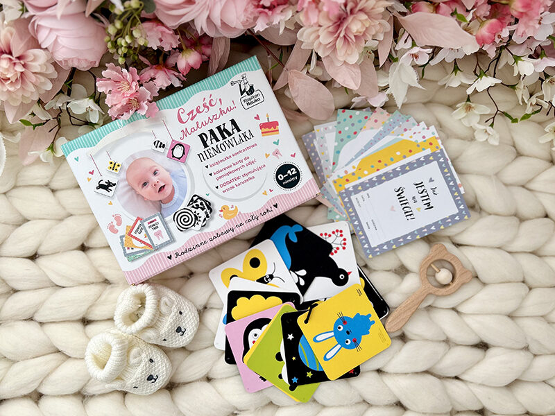 Zaczynamy od niesamowitego pakietu, który jest najlepszym dowodem na to, że książeczki i zabawki nie są zarezerwowane wyłącznie dla starszaków – śmiało mogą sięgać po nie także kilkumiesięczne, a nawet kilkutygodniowe dzieci! „Cześć, Maluszku! Paka niemowlaka” to ciekawy zestaw zapakowany w trwałe, kartonowe, utrzymane w pastelowych barwach pudełko (tak, idealne na prezent!). Powstał z myślą o dzieciach w wieku 0-12 miesięcy. A co znajdziecie w środku? Książeczkę kontrastową, na którą składa się aż 17 dwustronnych kart z prostymi, kontrastowymi ilustracjami o wyraźnie zarysowanych konturach. Większość ilustracji występuje w czerni i bieli, a więc dwóch kolorach, które najmłodsze dzieci widzą w pierwszej kolejności – nie brakuje też obrazów w kolorach rozpoznawanych przez dziecko w kolejnych miesiącach życia.