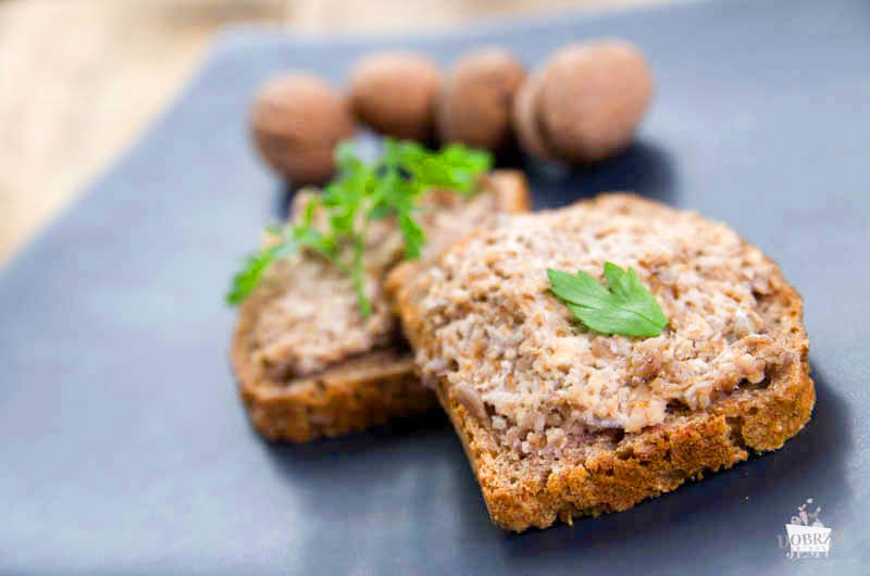 Orzechy i słonecznik zalej przegotowaną wodą i zostaw na minimum godzinę. Następnie odsącz i zmiksuj wraz z przyprawami. Możesz dodać do masy odrobinę wody, tak aby powstała pasta nie była zbyt gęsta. Pastę nakładaj na kanapki i dekoruj listkami pietruszki oraz kiełkami.