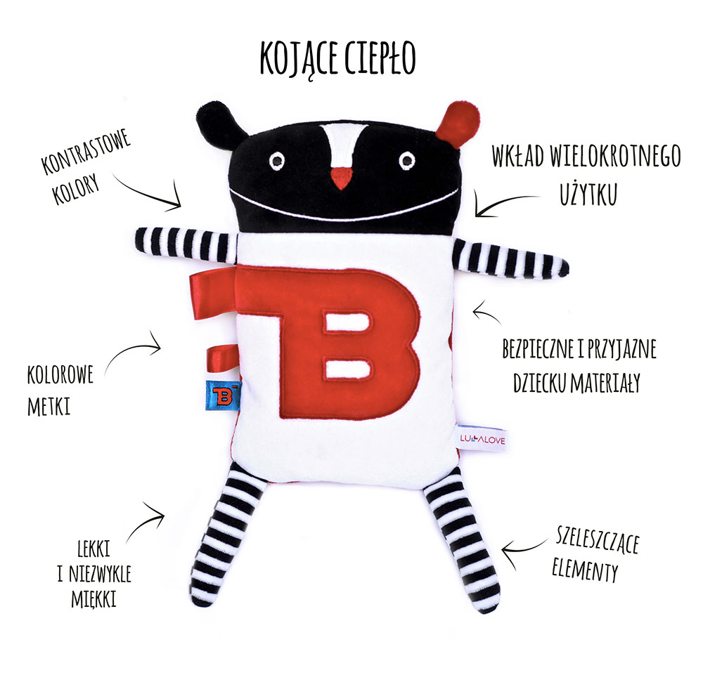 Przytulanka jest całkowicie bezpieczna dla dzieci, wykonana z miękkiego pluszu wypchanego antyalergiczną włókniną. Z boku ma wszyte kolorowe metki, które można mamlać do woli. Jedna z nóżek, podczas dotyku, przyjemnie szeleści. Pluszaka można z łatwością chwycić w małą rączkę i przytulać również wtedy, gdy wybieramy się na spacer. Podczas przeziębienia czy np. zapalenia oskrzeli, sprawdzi się jako ciepły kompres.