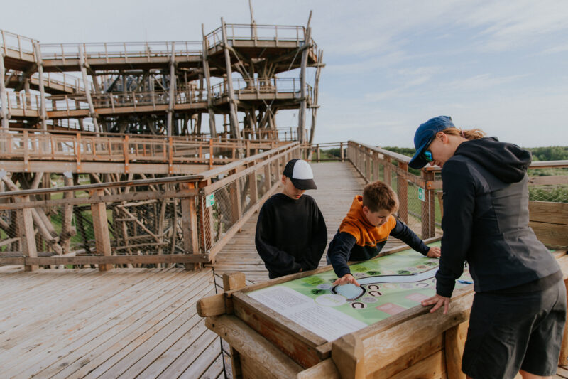 Podczas spaceru na wieżę widokową w ogóle nie czuliśmy, że cały czas idziemy pod górę. My, dorośli, delektowaliśmy się widokami, a średnia córka co kawałek czytała nam fragmenty historii tego miejsca, ponieważ po drodze na wieżę wszystko jest opisane. Ta historia niejednego zaskoczy. Bo co wspólnego miała bitwa pod Grunwaldem z Kurzętnikiem? I skąd wzięły się ruiny krzyżackiego zamku w tej wiosce, które tak pięknie widać z wieży? Nawet najstarsza oderwała się od telefonu, bo odkryła, że selfie z kładki wyglądają, jakby leciała samolotem.