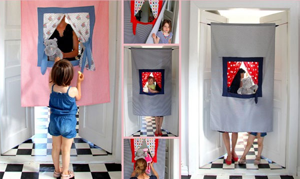 Przepis na zabawę: przynajmniej jeden aktor, sznurek, dwa drzewa lub inne punkty do których da się przymocować teatrzyk i oczywiście widownia. Przedstawienie można odegrać na podwórku, na biwaku czy w domu (zawieszając teatrzyk w futrynie drzwi). Kurtyna, którą odsłania się na czas przedstawienia, bardzo podoba się dzieciom. Dzięki temu, że zabawki (wszystkie) są szyte na nasze zamówienie, możemy wybrać kolor i wzór materiałów. Wymiary: 140x90cm.