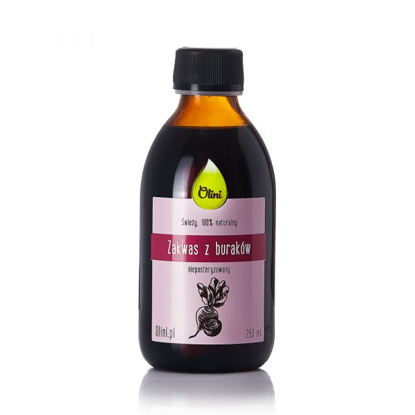 Zakwas z buraków z Rodzinnej Olejarni Olini to żywy, niepasteryzowany, w 100% naturalny napój probiotyczny. Powstaje w trakcie naturalnej fermentacji buraków. To prawdziwy napój mocy, który w świetny sposób wzbogaci dietę w naturalne kiszonki i probiotyki.